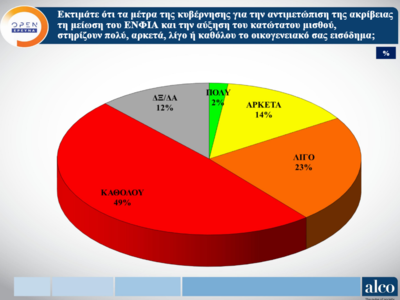 Επιπλέον, οι πολίτες εμφανίζονται ιδιαίτερα δυσαρεστημένοι για τα μέτρα αντιμετώπισης της ακρίβειας από την κυβέρνηση καθώς, στη σχετική ερώτηση, το 49% απαντά «καθόλου», το 23% «λίγο». Το 14% απαντά «αρκετά» και μόλις το 2% «πολύ».