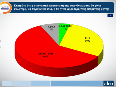 Χειρότερη θεωρεί ότι θα γίνει η οικονομική του κατάσταση το 60% όσων απαντούν, ενώ 29% εκτιμά ότι θα παραμείνει στα ίδια επίπεδα. Μόλις 4% απαντά ότι η οικονομική του κατάσταση θα βελτιωθεί.