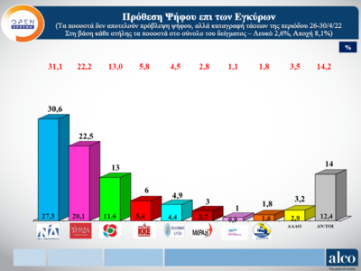 Συγκεκριμένα, η ΝΔ παραμένει πρώτη με 30,6% έναντι 22,5% του ΣΥΡΙΖΑ με τη διαφορά να είναι στο 8,1%. Σημειώνεται ότι η διαφορά στην προηγούμενη δημοσκόπηση της Alco τον Μάρτιο ήταν στο 8,9%, καθώς η ΝΔ είχε ποσοστό 31,1% και ο ΣΥΡΙΖΑ 22,2%. 3% και είσοδο στη Βουλή δείχνει η δημοσκόπηση το ΜέΡΑ25 ενώ εκτός βουλής με 1% και 1,% αντίστοιχα μένουν Πλεύση Ελευθερίας και Έλληνες για την Πατρίδα.