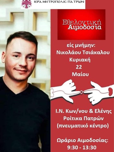 Εθελοντική αιμοδοσία θα γίνει την Κυριακή 22 Μαΐου 2022 στο Πνευματικό κέντρο του Ιερού Ναού Αγίων Κωνσταντίνου και Ελένης στα Ροίτικα της Πάτρας στη μνήμη του Νικολάου Τσιάκαλου που έχασε πέρυσι τον Μάιο τη ζωή τους σε τροχαίο δυστύχημα.