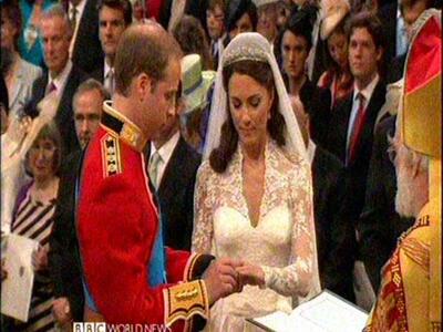 Περίπου 2000 καλεσμένοι -- από διασημότητες μέχρι μέλη βασιλικών οικογενειών -- συνέρευσαν στο ναό και παρακολούθησαν την Κέιτ, ντυμένη με ένα ιβουάρ νυφικό με δαντέλες, και τον Ουίλιαμ, με την κόκκινη στολή του συντάγματος των Ιρλανδών Φρουρών, να ανταλλάσσουν όρκους αμοιβαίας αφοσίωσης.