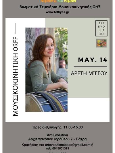 Βιωματικό σεμινάριο μουσικοκινητικής Orff, με αφετηρία ένα παραδοσιακό Ηπειρώτικο τραγούδι, τους συμβολισμούς και τις εικόνες του θα πραγματοποιήσει η Αρετή Μίγγου στην Πάτρα στις 14 Μαΐου.Όπως αναφέρει, θα το επεξεργαστούμε με το σώμα, την φωνή, τα όργανα. Με κίνηση, λόγο, μουσική, παιχνίδι. Μια ιστορία με πολυρυθμίες, πολυφωνίες και αυτοσχεδιασμό.