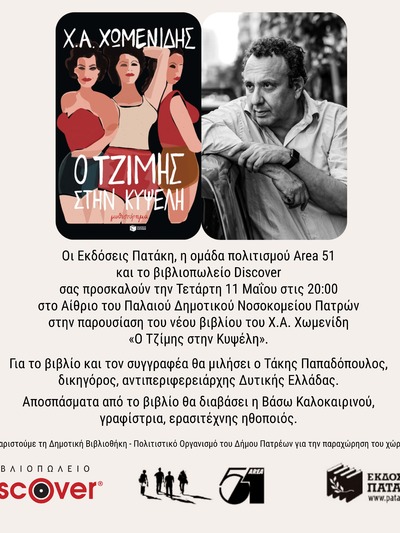 Οι Εκδόσεις Πατάκη, η ομάδα πολιτισμού Area 51 και το βιβλιοπωλείο Discover σας προσκαλούν σήμερα, Τετάρτη 11 Μαΐου και ώρα 20:00