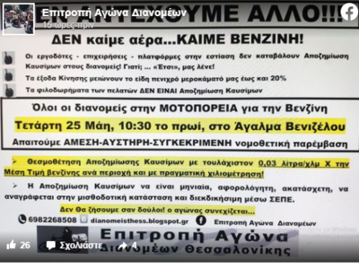 «Δεν Θα ζήσουμε σαν δούλοι» επισημαίνει η Επιτροπή Αγώνα των διανομέων που καλεί σε μοτοπορεία την Τετάρτη 25 Μαΐου, 10:30 το πρωί, στο Άγαλμα Βενιζέλου, στη Θεσσαλονίκη.