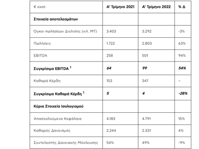 Η ΕΛΛΗΝΙΚΑ ΠΕΤΡΕΛΑΙΑ Συμμετοχών Α.Ε. ανακοίνωσε τα ενοποιημένα οικονομικά αποτελέσματα Α’ Τριμήνου 2022, με τα Συγκρίσιμα Κέρδη EBITDA να διαμορφώνονται σε €99 εκατ., αυξημένα κατά 54% σε σχέση με το αντίστοιχο Τρίμηνο του 2021, ενώ τα αντίστοιχα Καθαρά Κέρδη ανέρχονται σε €4 εκατ..