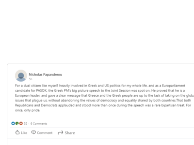 Έγραψε: «Για έναν πολίτη με διπλή υπηκοότητα όπως εγώ που ασχολείται με την πολιτική και στις ΗΠΑ και στην Ελλάδα όλη του την ζωή και ως υποψήφιος ευρωβουλευτής του ΠΑΣΟΚ, η μεγάλη εικόνα από την ομιλία του πρωθυπουργού στην κοινή συνεδρίαση του Κογκρέσου ήταν αυτή που έπρεπε. Απέδειξε ότι είναι ένας ευρωπαίος ηγέτης και έστειλε ξεκάθαρο μήνυμα ότι η Ελλάδα και ο ελληνικός λαός έχουν αποφασίσει να αναμετρηθούν με παγκόσμια θέματα που μας στοιχειώνουν χωρίς να εγκαταλείπουν τις αρχές της δημοκρατίας και της ισότητας αξίες που μοιράζονται και οι δυο χώρες. Το γεγονός ότι τόσο οι Ρεπουμπλικάνοι όσο και οι Δημοκρατικοί χειροκρότησαν όρθιοι πολλές φορές κατά την διάρκεια της ομιλίας του ήταν μια σπάνια διακομματική απόλαυση. Αυτή την φορά μόνο υπερηφάνια».