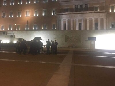 Σύμφωνα με πληροφορίες άπλωσε ένα πανό που έγραφε: «Βασιλιάς Μίνωας πραξικόπημα» και κρατούσε την καραμπίνα. Αμέσως το Σύνταγμα γέμισε περιπολικά και μηχανές της ΔΙΑΣ, ο δρόμος εκκενώθηκε και έκλεισε. Οι Εύζωνες φυσικά απομακρύνθηκαν από το μνημείο.