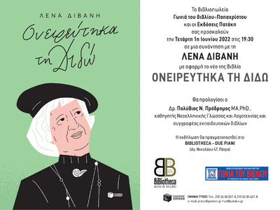 Η καθηγήτρια μέχρι πρόσφατα, ιστορίας εξωτερικής πολιτικής στη Νομική σχολή του Πανεπιστημίου Αθηνών και συγγραφέας Λένα Διβάνη που πραγματικά γράφει συναρπαστικά και εύληπτα βιβλία όπως το υπέροχο και αποκαλυπτικό βιβλίο «Ζευγάρια που έγραψαν την ιστορία της Ελλάδας» (Εκδόσεις Πατάκη, 2019) που ήταν για καιρό στα ευπώλητα της περιόδου της πανδημίας, θα είναι στην Πάτρα την Τετάρτη 1η Ιουνίου 2022. Πιο συγκεκριμένα το βιβλιοπωλείο «Η Γωνιά του βιβλίου» της οικογένειας Παπαχρίστου και οι Εκδόσεις Πατάκη συνδιοργανώνουν εκδήλωση την Τετάρτη 1η Ιουνίου 2022 στις 19:30 το απόγευμα στο BIBLIOTHECA-DUE PIANI (στην Αγ. Νικολάου 47, στην Πάτρα) όπου η Λένα Διβάνη θα έρθει και θα μιλήσει για το νέο της βιβλίο με τίτλο «Ονειρεύτηκα τη Διδώ».