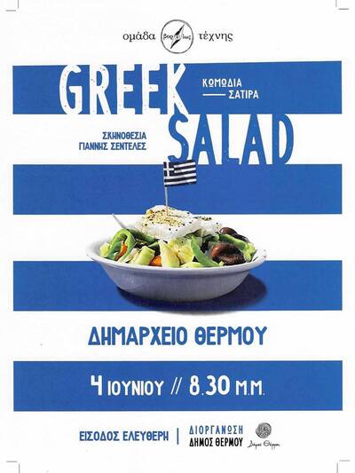 Η Ομάδα Τέχνης «Βορείως» πρόκειται να παρουσιάσει την κωμωδία – σάτιρα με τίτλο «Greek Salad» σε σκηνοθεσία του Γιάννη Σεντελέ, αυτό το Σάββατο 4 Ιουνίου 2022 και ώρα 8:30 μ.μ., στην αίθουσα του σεμιναριακού κέντρου στο ισόγειο του Δημαρχείου Θέρμου Αιτωλοακαρνανίας.