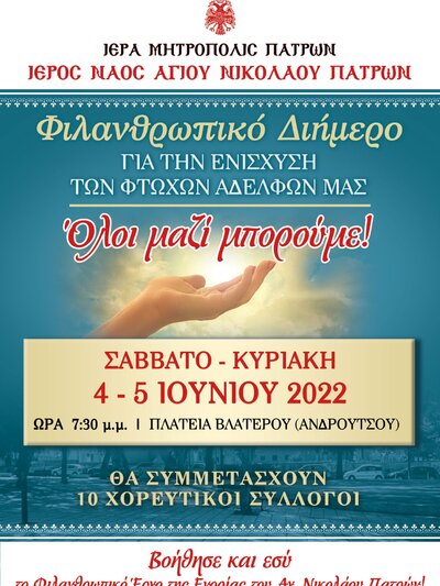 Ένα Φιλανθρωπικό Διήμερο για την ενίσχυση των φτωχών αδελφών μας διοργανώνεται από την Ιερά Μητρόπολη Πατρών και τον ιερό ναό Αγ. Νικολάου το σαββατοκύριακο 4 και 5 Ιουνίου 2022.