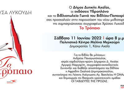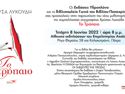 Την Τετάρτη 8 Ιουνίου 2022 στις 8 το βράδυ θα γίνει στην αίθουσα εκδηλώσεων του Επιμελητηρίου Αχαΐας στην Ρ. Φεραίου πλησίον της Κολοκοτρώνη, η παρουσίαση του νέου μυθιστορήματος της Αχαιής στην καταγωγή συγγραφέως Χρύσας Λυκούδη με τίτλο «Το Τρόπαιο» που κυκλοφορεί από τις εκδόσεις Υδροπλάνο.