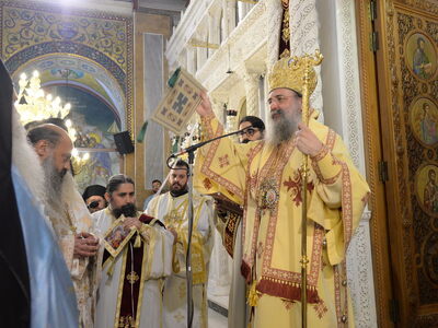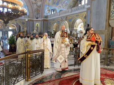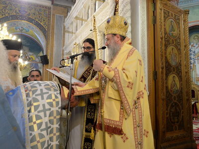 Της πανηγυρικής Θείας Λειτουργίας που μετέδωσε ζωντανά και το τηλεοπτικό κανάλι της Μητροπόλεως «Λύχνος», προέστη ο σεβασμιότατος Μητροπολίτης Πατρών κ.κ. Χρυσόστομος, συλλειτουργοῦντος του Θεοφιλεστάτου Επισκόπου Κερνίτσης κ. Χρυσάνθου.