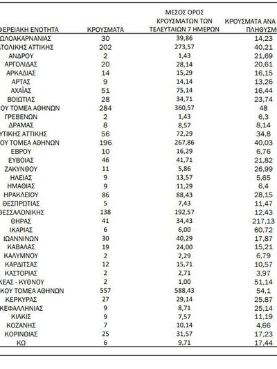 Στην Αχαΐα τα κρούσματα είναι 52, στην Αιτωλοακαρνανία 30 και στην Ηλεία 9. Η κατανομή των κρουσμάτων σήμερα στην Αττική είναι η εξής: