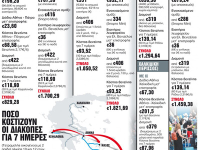 Πιο αναλυτικά, μια οικογένεια που θα επιλέξει τη Νάξο, θα ξοδέψει συνολικά 1.050,52 ευρώ αν μεταβεί με πλοίο, ενώ αν μεταβεί αεροπορικώς το ποσό εκτοξεύεται στα 1.821,69 ευρώ. Συγκεκριμένα, θα δαπανήσει 406 ευρώ για διαμονή, ενώ για μετακίνηση θα χρειαστεί 644,52 ευρώ με το πλοίο και 1.415,69 ευρώ αν επιλέξει το αεροπλάνο. Στην περίπτωση της Ρόδου, θα καταβάλει συνολικά 1.294,64 ευρώ με πλοίο και 1.459,38 ευρώ αν κινηθεί αεροπορικώς. Και στο σενάριο της Ρόδου παρατηρείται το ίδιο φαινομενο: Τα έξοδα μετακίνησης είναι τριπλάσια ή και τετραπλάσια συγκριτικά με τα έξοδα διαμονής (319 ευρώ διαμονή, 975,64 ευρώ με πλοίο, 1.140,38 ευρώ με αεροπλάνο). Για την Κεφαλονιά, το κόστος διακοπών με πλοίο αγγίζει τα 829,28 ευρώ, ενώ από αέρος τα 1.700,29 ευρώ. Εδώ, το κόστος διαμονής και μετακίνησης είναι σχεδόν το ίδιο στην περίπτωση του πλοίου (407,22 ευρώ με πλοίο και 422 ευρώ διαμονή) ενώ, με αεροπλάνο, το κόστος μετακίνησης είναι και πάλι τριπλάσιο σε σχέση με αυτό της διαμονής (1.278,29 ευρώ). Τέλος, αν η οικογένεια κλείσει διακοπές στη Χαλκιδική και μεταβεί με ΙΧ, θα χρειαστεί συνολικά 735,76 ευρώ (356,76 ευρώ για μετακίνηση και 379 ευρώ για διαμονή).