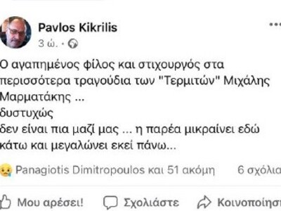 «Ο αγαπημένος φίλος και στιχουργός στα περισσότερα τραγούδια των Τερμίτων Μιχάλης Μαρματάκης… δυστυχώς δεν είναι πια μαζί μας… η παρέα μικραίνει εδώ κάτω και μεγαλώνει εκεί πάνω», έγραψε χαρακτηριστικά.