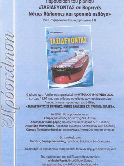 Το βιβλίο με τίτλο «Ταξιδεύοντας σε βορεινές, νότιες θάλασσες και τροπικά πελάγη» που έγραψε και κυκλοφόρησε τον Οκτώβριο του 2021 o Βασίλης Ζαφειρακόπουλος, Αρχιμηχανικός Ε.Ν, και αναφέρεται μέσα από την 45ετή θαλασσινή ζωή του στα μακρινά του ταξίδια σ’ όλους τους ωκεανούς και πελάγη, στα φυσικά φαινόμενα που συνάντησε και στις κουλτούρες των διάφορων λαών, πρόκειται να παρουσιαστεί σε εκδήλωση την Κυριακή 19 Ιουνίου 2022 στις 11 το πρωί στην αίθουσα του πρώην Δημαρχείου Λουσικών Αχαΐας.