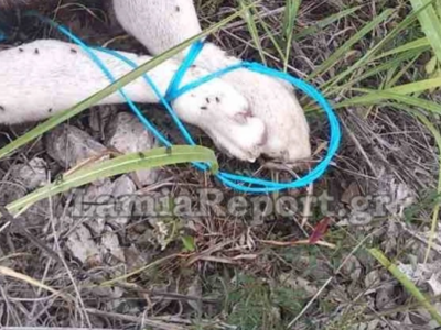 Είχε σκοινί περασμένο στο λαιμό του, ενώ δεμένε με αυτό ήταν και τα πίσω πόδια του. Από τα ίχνη γύρω του φαίνεται ότι βρήκε μαρτυρικό θάνατο.