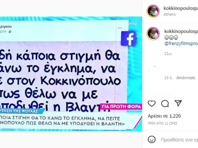 «Επειδή κάποια στιγμή θα το κάνω το έγκλημα, να πείτε στον Κοκκινόπουλο πως θέλω να με υποδυθεί η Βλαντή», έγραφε η δημοσίευσή της, με τον Πάνο Κοκκινόπουλο να απαντάει από κάτω: «Πες το κι έγινε».