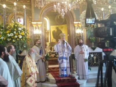 Στην ιερά αγρυπνία που πραγματοποιήθηκε στο βράδυ της Κυριακής λειτούργησε ο Πρωτοσύγκελος της Ι.Μ. Πατρών π. Αρτέμιος Αργυρόπουλος .