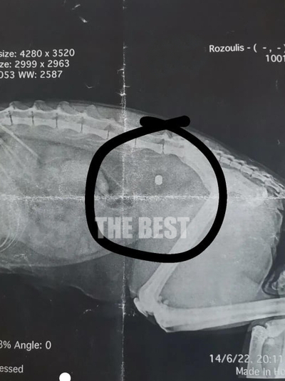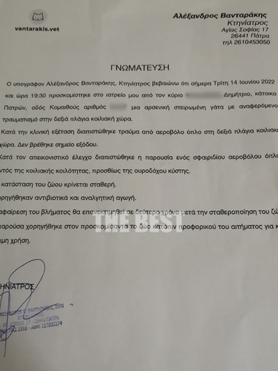 Λογικά νόμισαν ότι τσακώθηκε με άλλες γάτες. Η αδιαθεσία δεν έφευγε και τον πήγαν στον κτηνίατρο όπου και διαπιστώθηκε ότι είχε κτυπηθεί από σκάγι αεροβόλου όπλου.