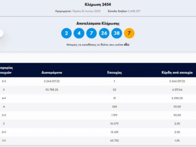 Στην πρώτη κατηγορία βρέθηκε μια επιτυχία που θα λάβει 2.264.017 ευρώ και στη δεύτερη κατηγορία κερδών 22 επιτυχίες που θα λάβουν από 4.217 ευρώ.