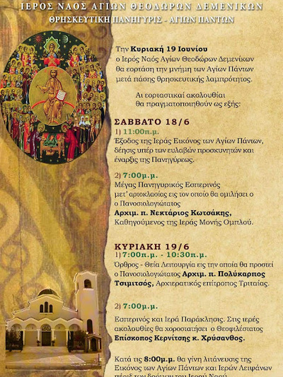 Ο Ιερός Ναός των Αγίων Θεοδώρων Δεμενίκων Πατρών θα εορτάσει και θα τιμήσει την Ιερά μνήμη Πάντων των Αγίων καθώς στον ως άνω Ναό φυλάσσεται Ιερά και σεβάσμια εικόνα των Αγίων Πάντων.