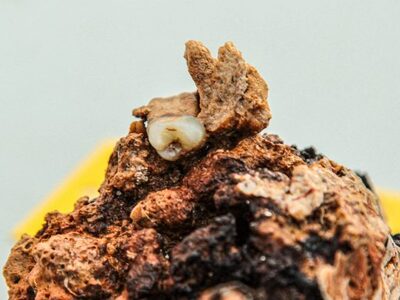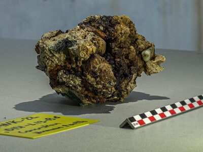 Η μεγάλη έκπληξη έρχεται από τη ανεύρεση δύο ανθρώπινων δοντιών πάνω σε συμπαγές συσσωμάτωμα με ίχνη χαλκού, το οποίο διά του γενετικού υλικού του θα βοηθήσει στον προσδιορισμό του φύλου και άλλων γενετικών χαρακτηριστικών του ανθρώπου στον οποίον ανήκαν.