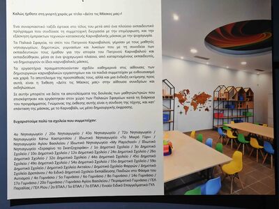Με μεγάλη επιτυχία πραγματοποιήθηκε το βράδυ του Σαββάτου 18 Ιουνίου 2022 στα Παλαιά Σφαγεία η γιορτή της χαράς «Δείτε τις μάσκες μας» με τη διοργανωτική φροντίδα της ΚΕΔΗΠ-Καρναβάλι Πάτρας και τη συνεργασία της Διεύθυνσης Π.Ε. και της Διεύθυνσης Δ.Ε. (τμήματα για την Περιβαλλοντική Εκπαίδευση και τα Πολιτιστικά θέματα).