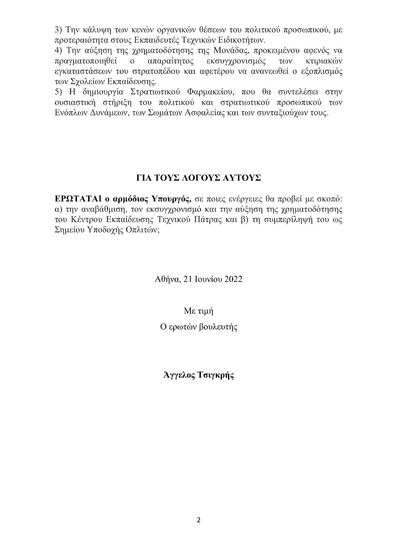 Συγκεκριμένα, ο Αχαιός βουλευτής ρωτάει τον Υπουργό Εθνικής Άμυνας, σε ποιες ενέργειες θα προβεί με σκοπό: α) την αναβάθμιση, τον εκσυγχρονισμό και την αύξηση της χρηματοδότησης του Κέντρου Εκπαίδευσης Τεχνικού Πάτρας και β) τη συμπερίληψή του ως Σημείου Υποδοχής Οπλιτών._