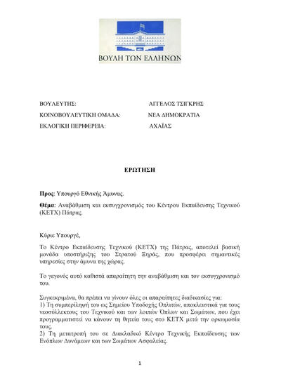 Στο πλαίσιο του κοινοβουλευτικού ελέγχου, ο βουλευτής Αχαΐας της Νέας Δημοκρατίας Άγγελος Τσιγκρής, κατέθεσε Ερώτηση προς τον Υπουργό Εθνικής Άμυνας, με την οποία ζητάει την αναβάθμιση και τον εκσυγχρονισμό του Κέντρου Εκπαίδευσης Τεχνικού (Κ.Ε.ΤΧ.) Πάτρας.