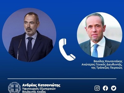 Τη διαβεβαίωση του Ανώτερου Γενικού Διευθυντή της Τράπεζας Πειραιώς, Βασίλη Κουτεντάκη, ότι τα υποκαταστήματα της Τράπεζας στα Καλάβρυτα και στην Κάτω Αχαΐας θα συνεχίσουν κανονικά τη λειτουργία τους, έλαβε ο Υφυπουργός Εξωτερικών και Βουλευτής Αχαΐας, Ανδρέας Κατσανιώτης.