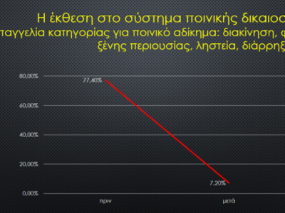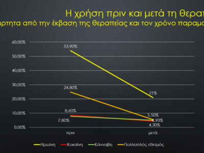 Σύμφωνα με το Διάγραμμα 1: Η χρήση πριν και μετά τη θεραπεία (ανεξάρτητα από την έκβαση της θεραπείας και τον χρόνο παραμονής), η θεραπεία απεξάρτησης σπάει το φαύλο κύκλο της χρήσης και της παραβατικότητας, καθώς σηματοδοτεί σαφή μείωση της έκθεσης στο ποινικό σύστημα και αποτελεί ισχυρό μέσο ειδικής πρόληψης: Ενώ 77,4% των ατόμων είχε ποινικές εκκρεμότητες πριν από τη θεραπεία, το ποσοστό μειώθηκε σε 7,2% μετά από αυτήν. Επιπλέον, η θεραπεία οδηγεί σε παραγωγική ένταξη στην κοινωνία: μετά τη θεραπεία το ποσοστό πλήρους απασχόλησης αυξάνεται κατά 72,4%.