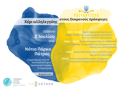 O νεοσύστατος σύλλογος Palyanytsya στηρίζοντας τους πρόσφυγες ουκρανούς και ομογενείς Έλληνες της Ουκρανίας θα συμμετάσχει στα πλαίσια της 26ης Πανελλαδικής Γιορτής Οικολογικής Γεωργίας και Χειροτεχνίας (1-3 Ιουλίου) στο Νότιο Πάρκο με δωρεάν δράσεις για παιδιά και οικογένειες.