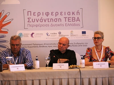 Από την μεριά του, ο Προϊστάμενος της γενικής Διεύθυνσης Δημόσιας Υγείας και Κοινωνικής Μέριμνας της Περιφέρειας Δυτ. Ελλάδας, Χρήστος Παπασημακόπουλος, παρουσίασε το πρόγραμμα ΤΕΒΑ. Αναφερόμενος στην πορεία εξέλιξης του έργου, υποστήριξε ό,τι ο συνολικός αριθμός ωφελούμενων που παρέλαβαν Τρόφιμα στην Αχαΐα, αντιστοιχεί σε 24.848 και ο συνολικός αριθμός ωφελούμενων που παρέλαβαν ΒΥΣ, αντιστοιχεί σε 15.601. Στην Αιτωλοακαρνανία αντιστοιχεί σε 26.288 και ο συνολικός αριθμός ωφελούμενων που παρέλαβαν ΒΥΣ σε 21.457. Στην Ηλεία αντιστοιχεί σε 19.083 και ο συνολικός ωφελούμενων που παρέλαβαν ΒΥΣ σε 12.922.