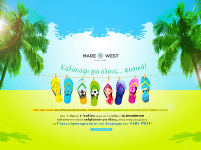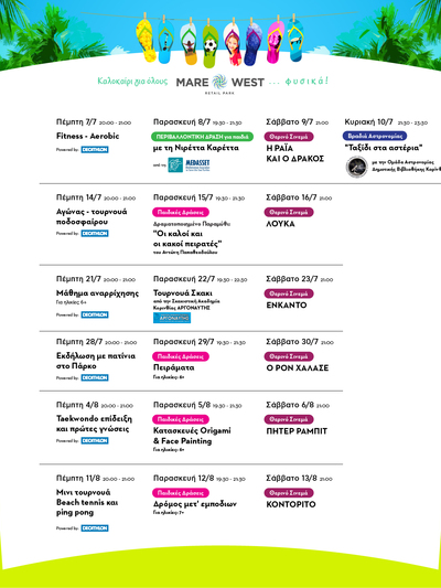 Αυτό το καλοκαίρι, το καλύτερο σκηνικό το φτιάχνει η φύση και οι εκδηλώσεις του εμπορικού πάρκου Mare West. Με επιλογές για κάθε ηλικία, το Πάρκο Δραστηριοτήτων και Αναψυχής, γίνεται για ακόμα μία χρονιά σημείο συνάντησης και διασκέδασης με φόντο το πράσινο και τη θάλασσα. Ξεκινώντας από τις 7 Ιουλίου και κάθε Πέμπτη, Παρασκευή και Σάββατο μέχρι και τις 13 Αυγούστου, αλλά και την Κυριακή 10 Ιουλίου, η διασκέδαση δίνει ραντεβού με όλους στο Mare West.