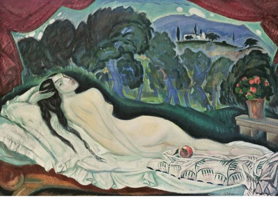 Γεννημένος στην Αλεξάνδρεια της Αιγύπτου από πατέρα Έλληνα καπνέπομπορο και μητέρα Ιταλίδα, ο Κωνσταντίνος Παρθένης απέκτησε διεθνή παιδεία και σπούδασε ζωγραφική στην Ακαδημία Καλών Τεχνών της Βιέννης. Εζησε για μια περίοδο στο Παρίσι και όταν επέστρεψε,, με νωπές ακόμη τις εντυπώσεις από τα ζωηρά χρώματα των Fauves και των Nabis, παρουσίασε μερικά γοητευτικά ύπαιθρα εκ του φυσικού, ιδιαίτερα στην Κέρκυρα, αλλά και σε άλλα μέρη της Ελλάδας, χωρίς συμβολιστικές παραδηλώσεις. Μόνο αυτή την περίοδο ο ζωγράφος συμπλέει με τους ομοτέχνους του της «Ομάδας Τέχνη», που φιλοτεχνούν τις δυο πρώτες δεκαετίες του αιώνα έργα αμιγώς υπαιθριστικά, ανταποκρινόμενοι στο αίτημα της δημιουργίας ενός ελληνικού μοντερνισμού. Η δεκαετία του ’20 θα δει τον Παρθένη να αποσύρεται βαθμιαία από τα εγκόσμια και να βυθίζεται στον οραματικό κόσμο της ώριμης ζωγραφικής του, που ενοικείται από αλληγορικές και συμβολικές παραστάσεις. Οι μορφές του, καμπυλόγραμμες, κυματοειδείς, χορευτικές, εντάσσονται αρμονικά στον χώρο δημιουργώντας μελωδικές ρίμες με τα περιβάλλοντα συνθετικά στοιχεία, δέντρα, βουνά, λόφους. Μνήμες από τους Ευρωπαίους συμβολιστές, παλαιότερους και νεότερους (Puvis de Chavannes, Maurice Denis, Ferdinand Hodler), αλλά και επιδράσεις από το Βυζάντιο ή τον Θεοτοκόπουλο, απόλυτα χωνεμένες και υποταγμένες στον προσωπικό κώδικα του ζωγράφου, ανιχνεύονται στα έργα αυτής της περιόδου.