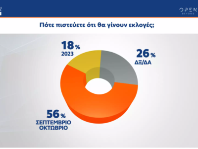 Κατά τα άλλα, το 56% πιστεύει πως οι εκλογές θα γίνουν το διάστημα Σεπτέμβριο με Οκτώβριο, ενώ το 18% ότι θα διεξαχθούν μέσα στο 2023.