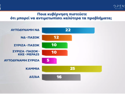 Από εκεί και πέρα το 25% όσων ρωτήθηκαν απαντά πως καμία κυβέρνηση δεν θα μπορούσε να αντιμετωπίσει καλύτερα τα προβλήματα της χώρας, ενώ το 22% απαντά πως μια αυτοδύναμη κυβέρνηση Νέας Δημοκρατίας θα μπορούσε να τα αντιμετωπίσει καλύτερα.