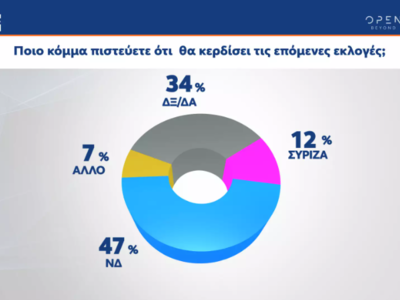 Το 47% θεωρεί πως τις εκλογές θα τις κερδίσει η Νέα Δημοκρατία, ενώ το 12% ο ΣΥΡΙΖΑ. Το 7% απαντά άλλο κόμμα. 7%.