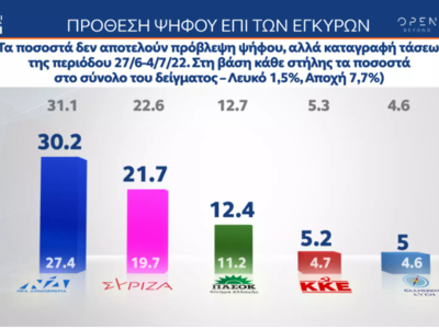 Οσον αφορά στην πρόθεση ψήφου επί των έγκυρων, η ΝΔ συγκεντρώνει 30,2% (από 31,1% τον Ιούνιο) και ο ΣΥΡΙΖΑ 21,7% (από 22,6%), με τη διαφορά να είναι στις 8,5 μονάδες. Ακολουθούν το ΠΑΣΟΚ/ΚΙΝΑΛ 12,4% (από 12,7%), το ΚΚΕ 5,2% (από 5,3%), η Ελληνική Λύση 5% (από 4,6%) και το ΜέΡΑ25 με 3% (από 3,5%). Οι αναποφάσιστοι συγκεντρώνουν το 14,1%, ενώ το 5,6% απαντά «άλλο κόμμα».