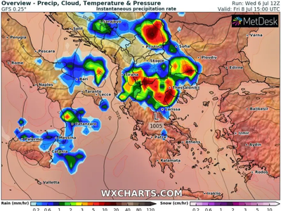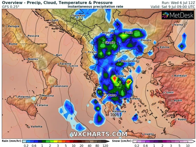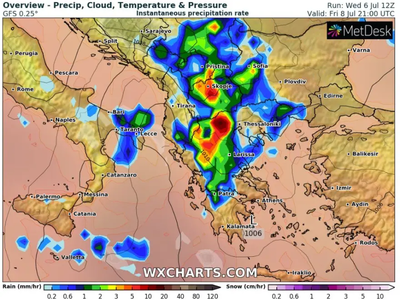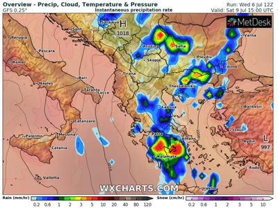 Σύμφωνα με τους μετεωρολόγους τα δυτικά, κεντρικά και βόρεια γεωγραφικά διαμερίσματα της χώρας θα δεχτούν τον μεγαλύτερο όγκο βροχών - καταιγίδων, ενώ δεν αποκλείεται να σημειωθούν χαλαζοπτώσεις, πλημμυρικά φαινόμενα, ανεμοστρόβιλοι - υδροστρόβιλοι αλλά και έντονοι κεραυνοί. (Εικόνα 3,4 η ένταση της βροχής το πρωι και το μεσημέρι του Σαββάτου)