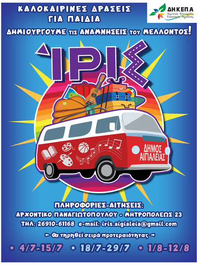 Με τις καλοκαιρινές Δράσεις «Ίρις» που γίνονται στο «Πολύκεντρο» στη Μυρτιά Αιγίου, η Δ.Η.Κ.Ε.Π.Α. δημιουργεί τις συνθήκες για ένα συναρπαστικό καλοκαίρι, αναφέρει η σχετική ανακοίνωση.