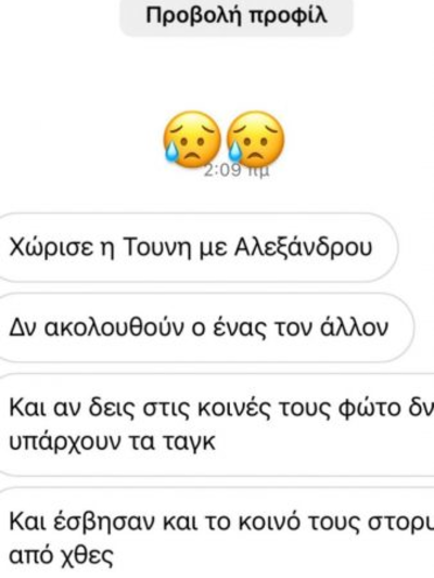 Όλα ξεκίνησαν από τον βομβαρδισμό μηνυμάτων που δέχτηκε το βράδυ της Δευτέρας στο προφίλ της Σούλας Γκλάμορους, αναφορικά με το ότι ο Δημήτρης έχει αφαιρέσει όλα τα tag με το όνομά του από τις κοινές φωτογραφίες που έχει με την Τούνη και το αντίστροφο!