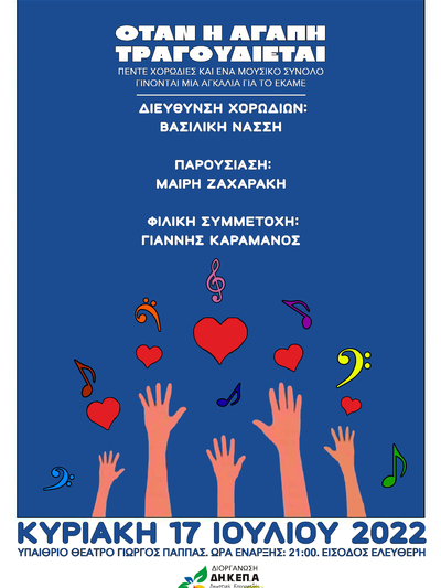 Τα χορωδιακά σύνολα της ΔΗ.Κ.ΕΠ.Α. που αποτελούνται από την Παιδική - Νεανική Χορωδία Αιγιαλείας, το Νεανικό Χορωδιακό Σύνολο Αιγιαλείας, τη Χορωδία Ενηλίκων Διακοπτού και τη Χορωδία ΚΑΠΗ Αιγίου σε συνεργασία με τις Χορωδίες του Πολιτιστικού Συλλόγου «Αίολος» Βαλιμιτίκων και του Φιλοπροοδευτικού Ομίλου Λόγγου «Ο Βύρων», θα παρουσιάσουν αυτή την Κυριακή 17 Ιουλίου 2022 στις 9 μ.μ. στο υπαίθριο θέατρο «Γιώργος Παππάς», μια μοναδική συναυλία. Σκοπός της εκδήλωσης είναι η ευαισθητοποίηση του κοινού στους στόχους και τις προοπτικές του ΕΚΑΜΕ -Ειδικό Κέντρο Αποκατάστασης και Μέριμνας Ατόμων με Ειδικές Ανάγκες Αιγίου.