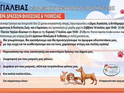 Στην καρδιά του καλοκαιριού, δύο υπέροχες ανοιχτές δράσεις φιλοζωίας και υιοθεσίας διοργανώνουν από κοινού ο Δήμος Αιγιαλείας, οι Αντιδημαρχίες Καθαριότητας και Ποιότητας Ζωής και ο "Λαμπ-Οίκος". Αυτό το Σάββατο 16 Ιουλίου 2022, από τις 7 έως τις 9.30 μ.μ. στην Πλατεία Υψηλών Αλωνίων στο Αίγιο και την Κυριακή 17 Ιουλίου, από τις 7 έως τις 9.30 μ.μ. στην πλατεία Παραλίας Συλιβαινιωτίκων της Ακράτας, μικροί και μεγάλοι θα γνωρίσουν, θα αγαπήσουν και θα προσεγγίσουν όμορφα και χαριτωμένα «αδεσποτάκια», με την ευχή να υιοθετηθούν και να βρουν στέγη και πολλή αγάπη.