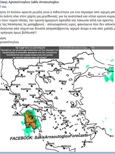 Στην ανάρτησή του στο facebook ο Σάκης Αρναούτογλου αναφέρει χαρακτηριστικά: Την Τετάρτη 13 Ιουλίου αρκετά μεγάλη είναι η πιθανότητα για ένα πέρασμα από ισχυρή μπόρα ή καταιγίδα, για τα ανατολικά και νότια ορεινα κυρίως τμήματα τουν νομού Ηλείας, την ορεινή-ημιορεινή Αρκαδία και Λακωνία αλλά και αρκετές περιοχές της Μεσσηνίας τις μεσημβρινές – απογευματινές ώρες, φαινόμενα που δεν αποκλείεται να συνοδεύονται από συχνά και δυνατά αστραπόβροντα, ισχυρό άνεμο ή και από χαλάζι με σχετικά γρήγορη όμως βελτίωση!!!
