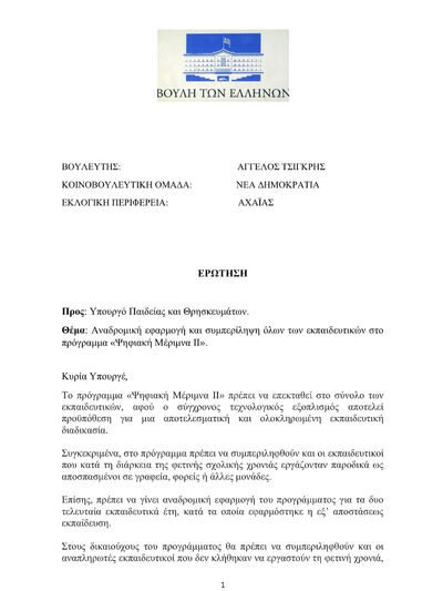 Ο Άγγελος Τσιγκρής φέρνει στη Βουλή την αναδρομική εφαρμογή και συμπερίληψη όλων των εκπαιδευτικών στο πρόγραμμα «Ψηφιακή Μέριμνα ΙΙ»Στο πλαίσιο του κοινοβουλευτικού ελέγχου, ο βουλευτής Αχαΐας της Νέας Δημοκρατίας Άγγελος Τσιγκρής κατέθεσε Ερώτηση προς την Υπουργό Παιδείας, με την οποία ζητάει την αναδρομική εφαρμογή και συμπερίληψη όλων των εκπαιδευτικών στο πρόγραμμα "Ψηφιακή Μέριμνα ΙΙ".
