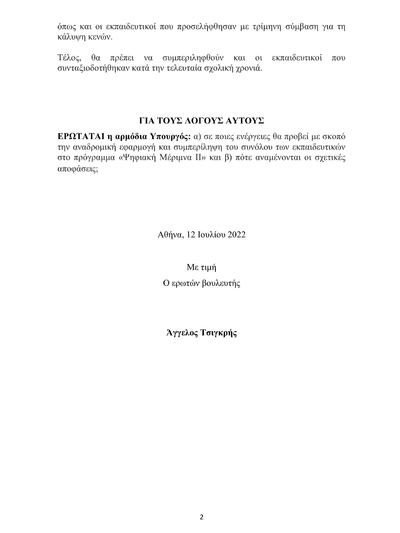 Συγκεκριμένα, ο Αχαιός βουλευτής ρωτάει την Υπουργό Παιδείας: α) σε ποιες ενέργειες θα προβεί με σκοπό την αναδρομική εφαρμογή και συμπερίληψη του συνόλου των εκπαιδευτικών στο πρόγραμμα «Ψηφιακή Μέριμνα ΙΙ» και β) πότε αναμένονται οι σχετικές αποφάσεις._