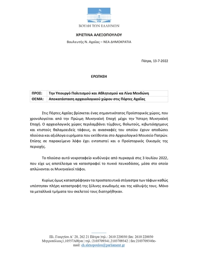 Η Βουλευτής Αχαΐας της ΝΔ, Χριστίνα Αλεξοπούλου στο πλαίσιο κοινοβουλευτικού ελέγχου κατέθεσε Ερώτηση προς την Υπουργό Πολιτισμού κα Λίνα Μενδώνη σχετικά με τις ζημιές που προκλήθηκαν στον αρχαιολογικό χώρο στις Πόρτες Αχαΐας από την πυρκαγιά της 3ης Ιουλίου.