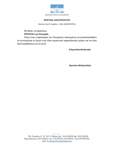 Η Αχαιή Βουλευτής ζητά με Ερώτησή της, να ενημερωθεί για τις κινήσεις και το χρονοδιάγραμμα του Υπουργείου Πολιτισμού για την αποκατάσταση των καταστροφών στον περιβάλλοντα χώρο του μνημείου καθώς και στις υποδομές του. Ο χώρος σήμερα δεν είναι προσβάσιμος για το κοινό μετά την πυρκαγιά.